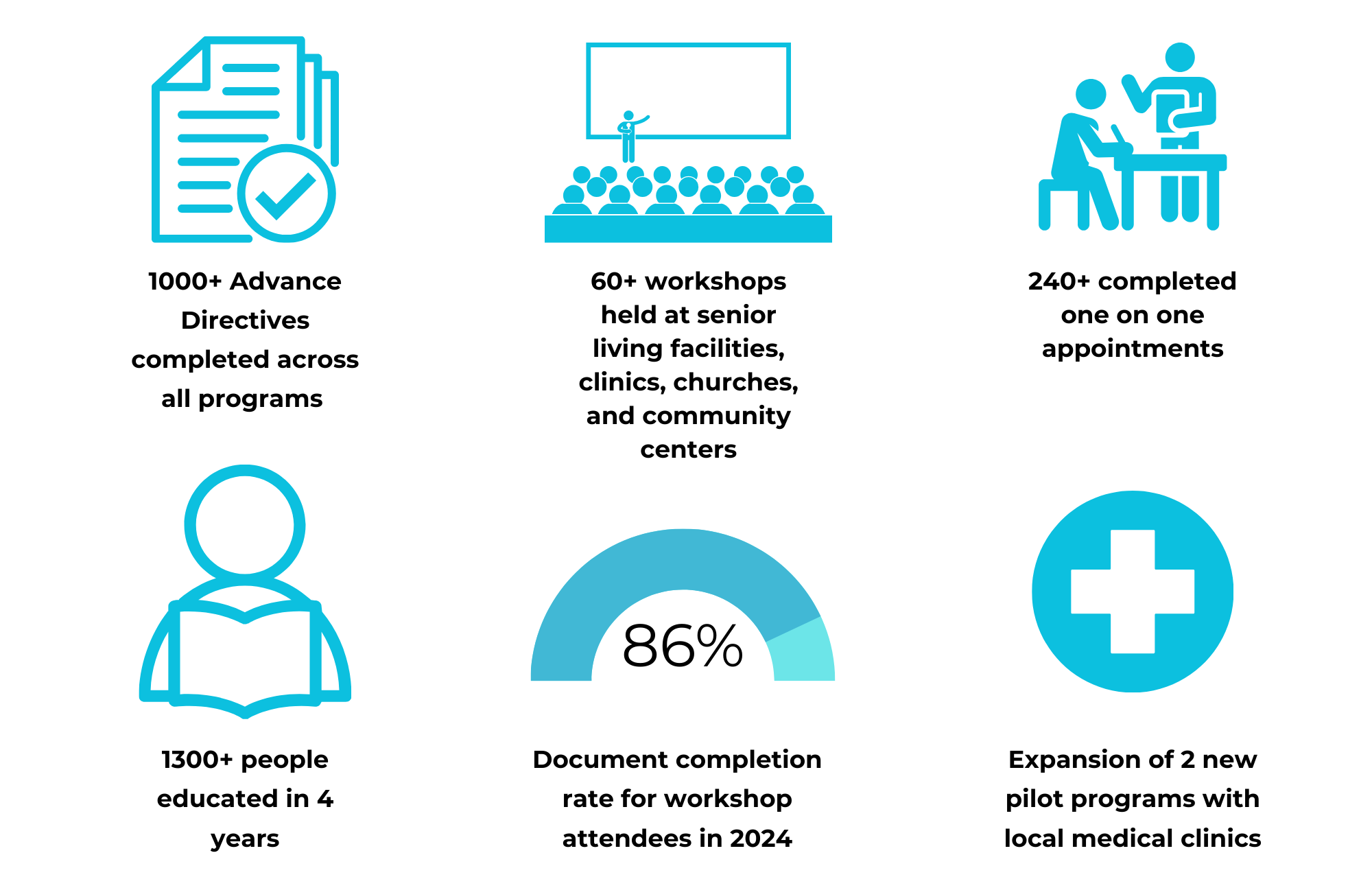 Whether guiding someone through their very first conversation about end-of-life care, helping complete the Advance Directive form, or coordinating a free notary service to finalize the document, volunteers walk with participants every step of the way. These peer-led conversations are often life-changing—for both the participant and the volunteer.