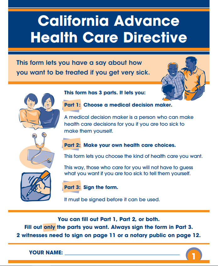 California Advance Healthcare Directive: The California Advance Healthcare Directive helps individuals select a medical decision maker and choose the types of healthcare they want to receive including life support treatment and palliative care.