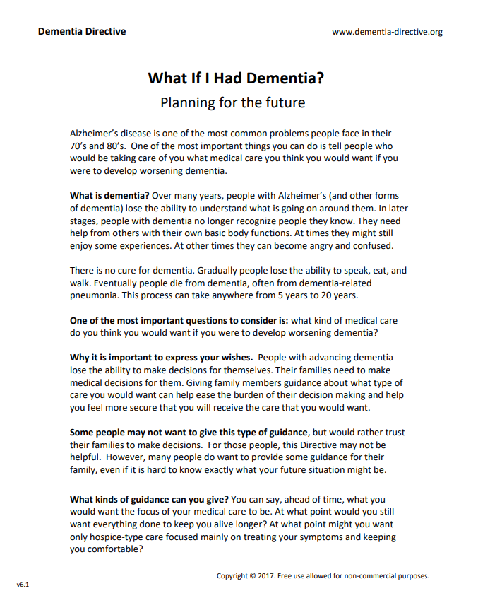Dementia Directive: The Dementia Directive is a simple and effective way to communicate your wishes if you were to develop dementia. A Dementia Directive can be used as a stand-alone document to communicate one’s wishes. It can also be included as a supplement, attached to someone’s standard advance directive form.